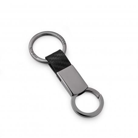 Nøgleringen er lavet af ægte læder med et præget carbon look, samt et udpræget maskulin, sporty look. Derudover giver det mørkpoleret nikkel et elegant look, som oser af enkelthed og diskretion.