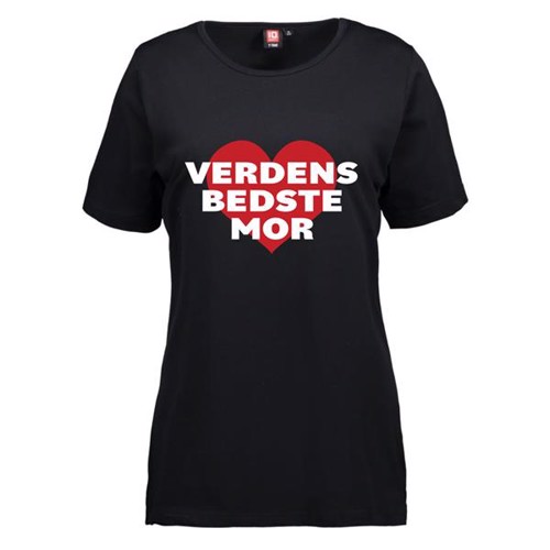 T-shirt med VERDENS BEDSTE MOR logo trykt i rød og hvidt på fronten.